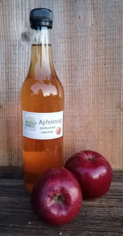 Der Apfelessig wird durch Fermentation aus frischem Apfelsaft und anschliessender Reifung gewonnen.